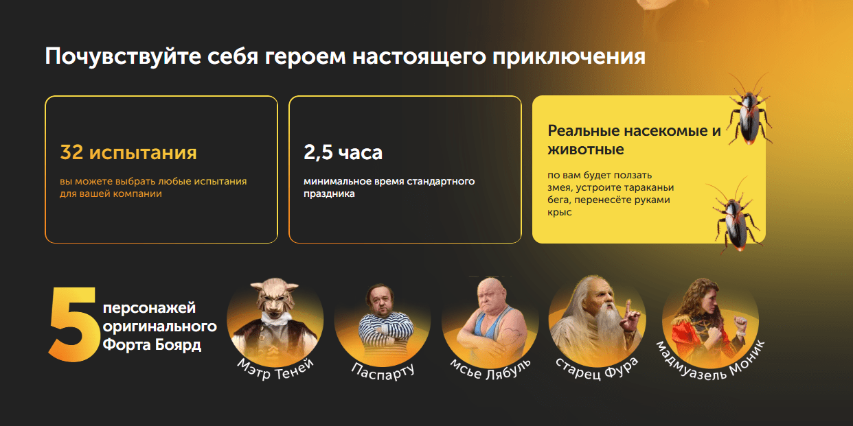 От других площадок их отличает набор сильных сторон: — пять актёров-персонажей вместо стандартных двух-трёх; — живые животные и насекомые, элементы контактного зоопарка; — 32 испытания — больше, чем у любых конкурентов в регионе.