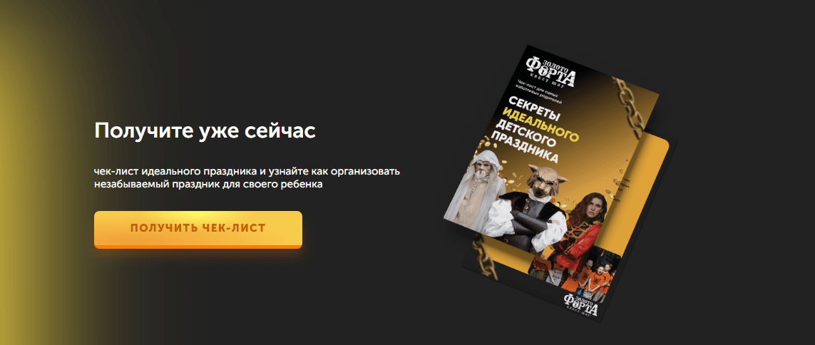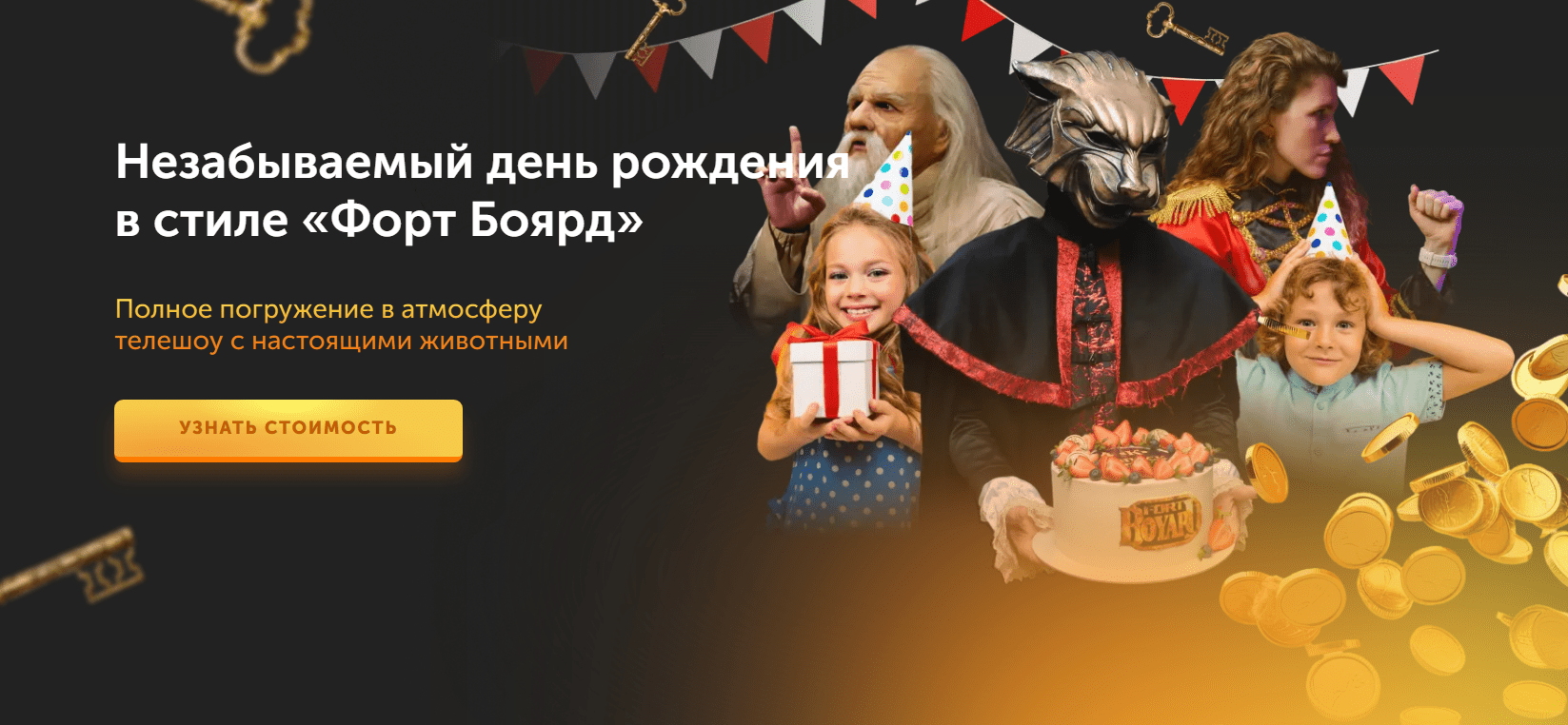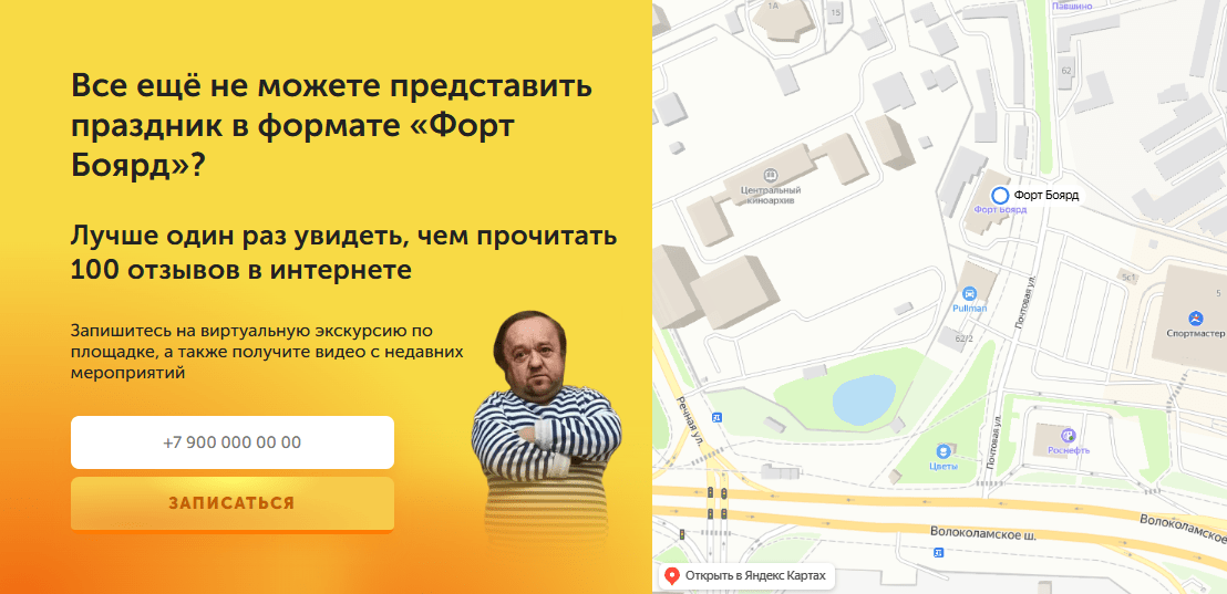 Сделали отдельные страницы под каждый формат — день рождения, корпоратив, выпускной и другие. На первом экране — целевой заголовок. Не абстрактный «Праздник в квест-центре», а прямой ответ на запрос: «Незабываемый день рождения в стиле Форт Боярд».