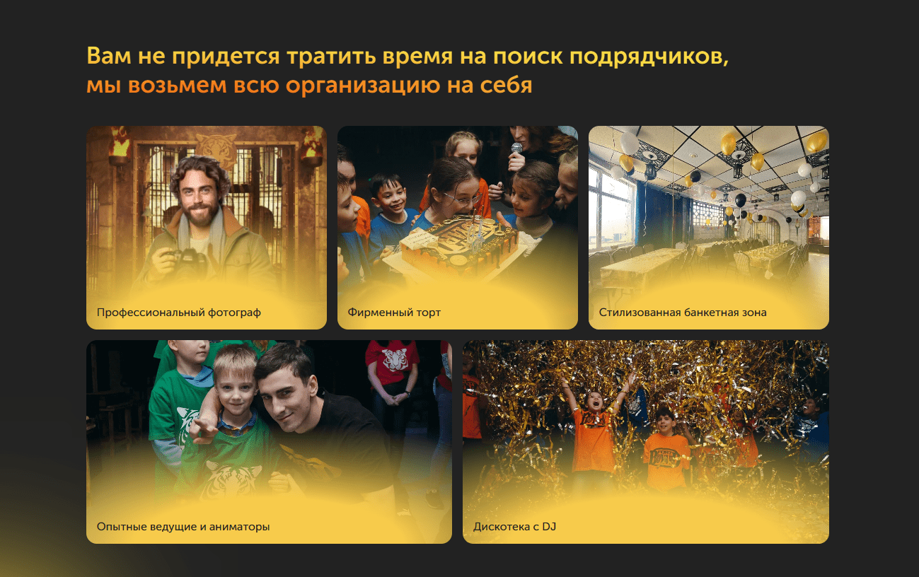 Закрыли главную боль ЦА через блок «всё под ключ». Гигиенический минимум: «Вам не придётся искать аниматоров, фотографа и торт — мы сделаем всё сами».