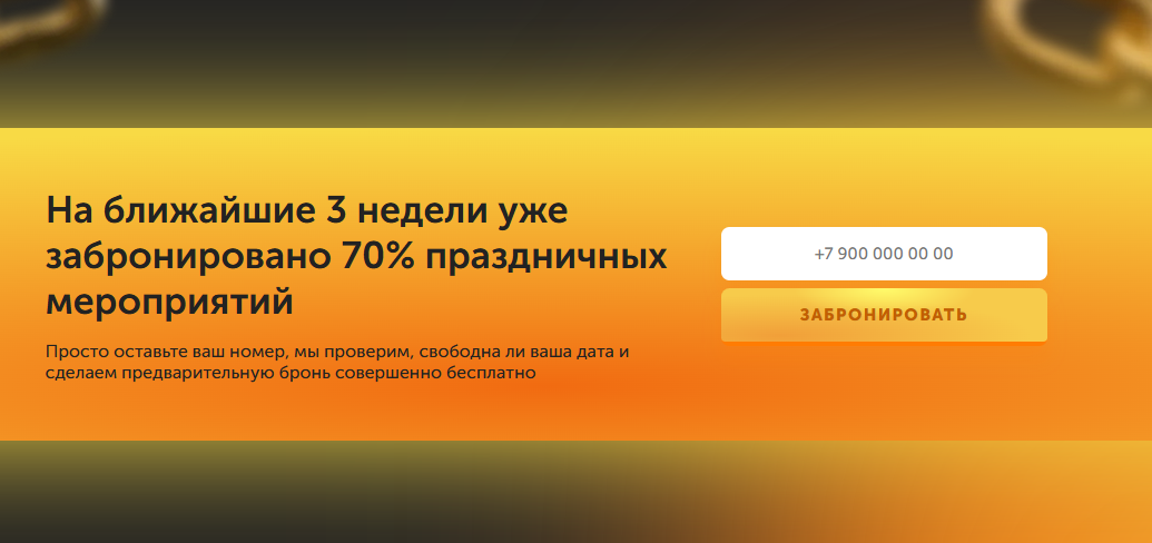 Вставили квиз, лид-магнит, фото, видео. Сделали отдельный блок с эффектом дефицита: «70% дат уже занято» — чтобы стимулировать решение.